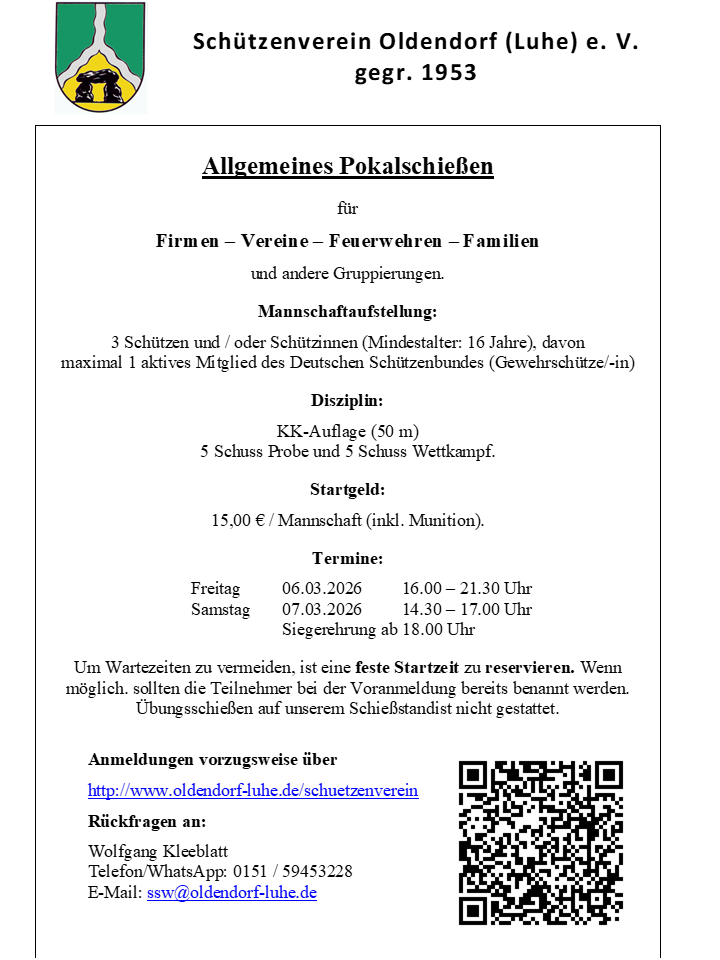 Der Schützenverein Oldendorf (Luhe) e.V. startete auch in 2026 wieder das beliebte und inzwischen zur Tradition gewordene Pokalschießen für Firmen, Vereine, Organisationen, Familien, Freundeskreise und alle anderen denkbaren Gruppierungen.